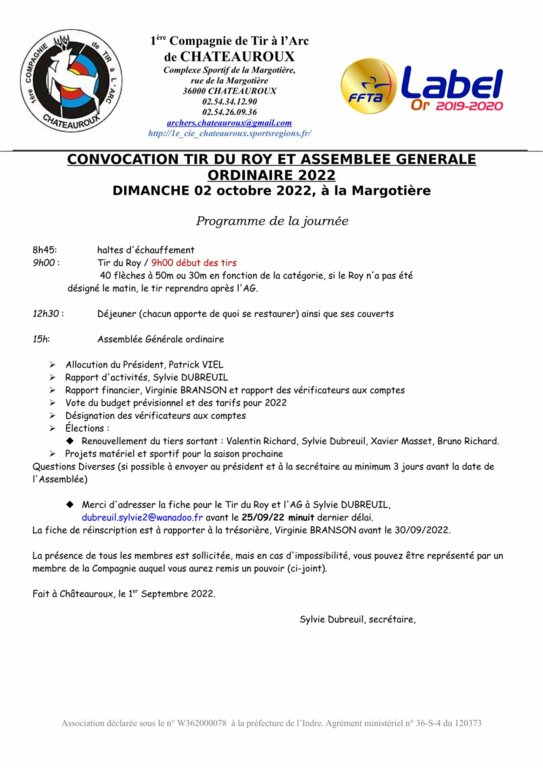 L'assemblée générale du club aura lieu le 02/10/22, ci joint la convocation. Vous trouverez également la fiche de candidature pour ceux qui voudraient participer à la vie du club, l'inscription pour le tir du Roy ainsi que le pouvoir pour ceux qui ne pourront être présents.